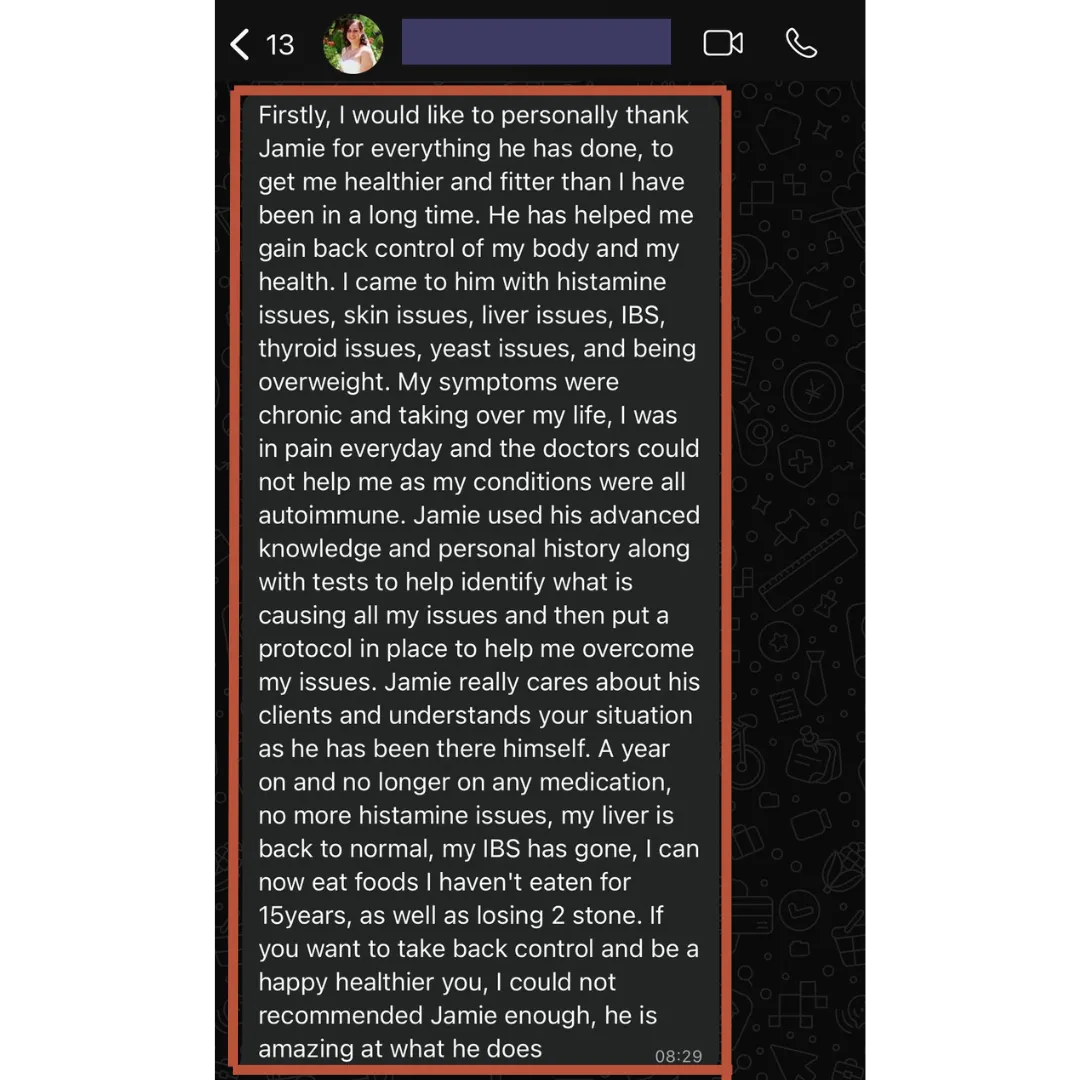 Jamie has over 10 years of experience in the health and fitness industry. He transitioned into this field driven by his passion and personal chronic health issues, which included mould poisoning, yeast issues, bacterial overgrowths, MCAS (histamine issues), leaky gut, H. Pylori and chronic food sensitivities, among others. These experiences fueled his dedication to learning and self-improvement, shaping him into the coach he is today. Jamie's career has evolved from a standard personal trainer in a gym to a health-focused physique coach at a renowned bodybuilding gym in London and now to a fully online health and physique coach. He utilises functional medicine, blood work analysis and more to help clients. Having studied under 13 mentors and invested over £50,000+ in continued education, Jamie has developed a comprehensive system to support clients mentally, physically, and emotionally. You can be confident in his ability to guide you, as long as you’re ready to prioritise your health.